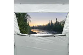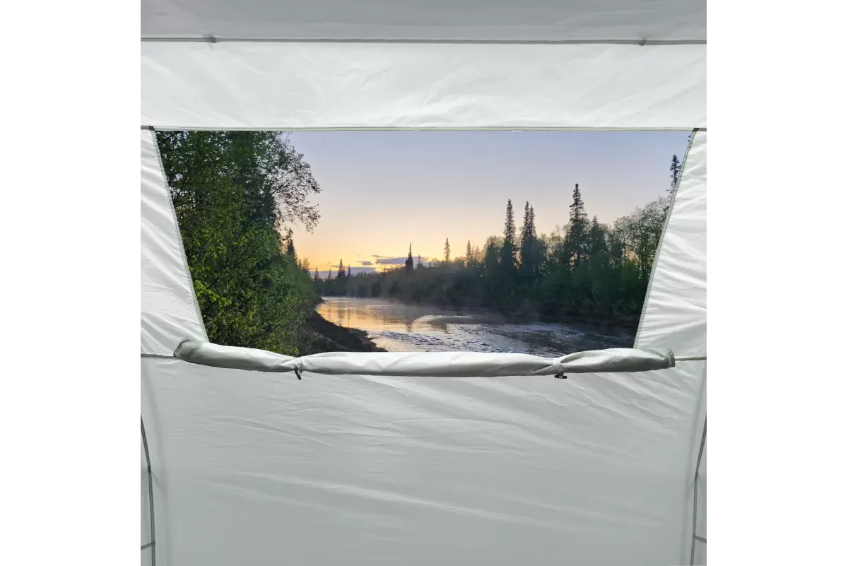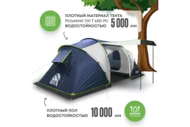 Внешний тент выполнен из полиэстера 210T 68D с водонепроницаемостью 5000 мм. Пол палатки изготовлен из материала Tarpayling высокой плотности с водонепроницаемостью 10000 мм. Все швы и молнии проклеены термоусадочной лентой для исключения протеканий. По периметру палатки пришита защитная юбка.