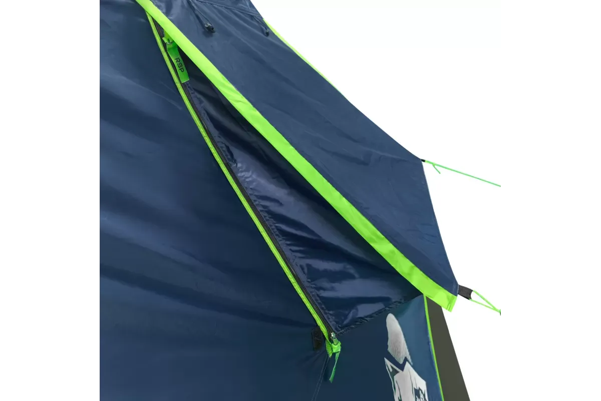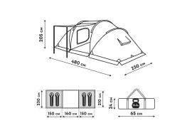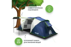Дуги сборные из фибергласса диаметром 9,5 и 11 мм с металлическими наконечниками. Конструкция усилена штормовыми оттяжками, прошитыми светоотражающей нитью. Предусмотрена возможность установки верхнего тента до основной палатки, что позволяет не замочить спальню и вещи при установке в дождь.