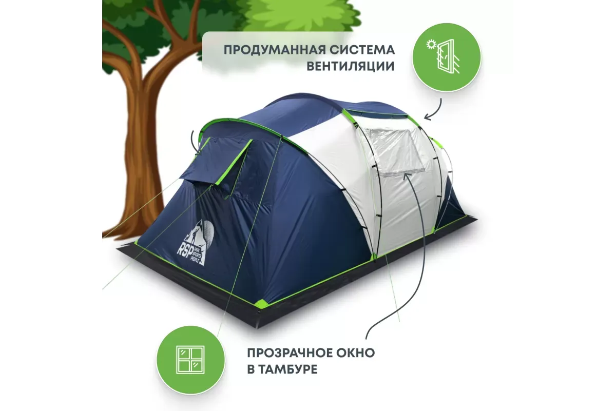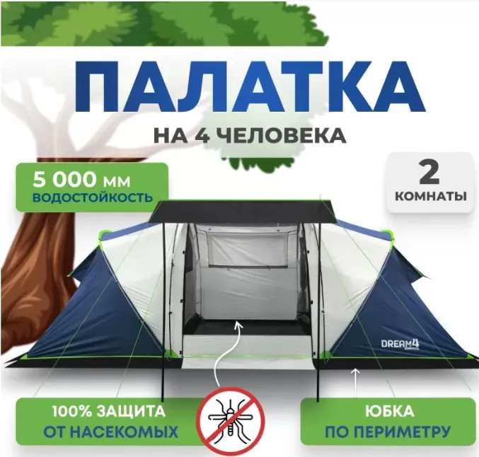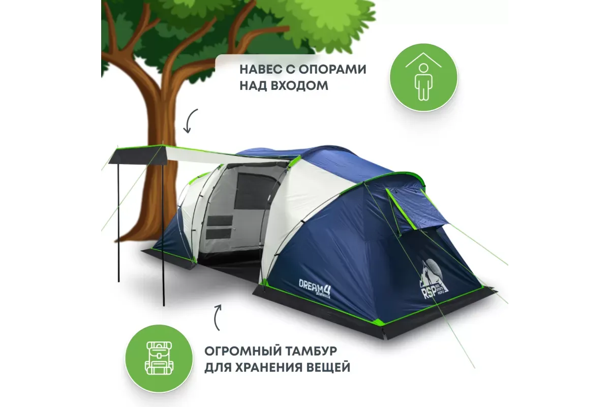 Кемпинговая палатка RSP Dream 4 предназначена для продолжительного отдыха на природе всей семьей или компанией. Рассчитана на размещение 4 человек. Конструкция включает просторный тамбур размером 160 х 230 см и высотой 195 см, а также две отдельные спальные комнаты на 2 места каждая.