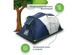Палатка двухслойная, что предотвращает скапливание конденсата. Имеет три вентиляционных клапана с многоуровневой регулировкой потока воздуха, все оснащены москитными сетками. В спальных комнатах предусмотрены большие вентиляционные окна с возможностью фиксации в разных положениях. Вход в тамбур и двери в спальни продублированы москитными сетками.