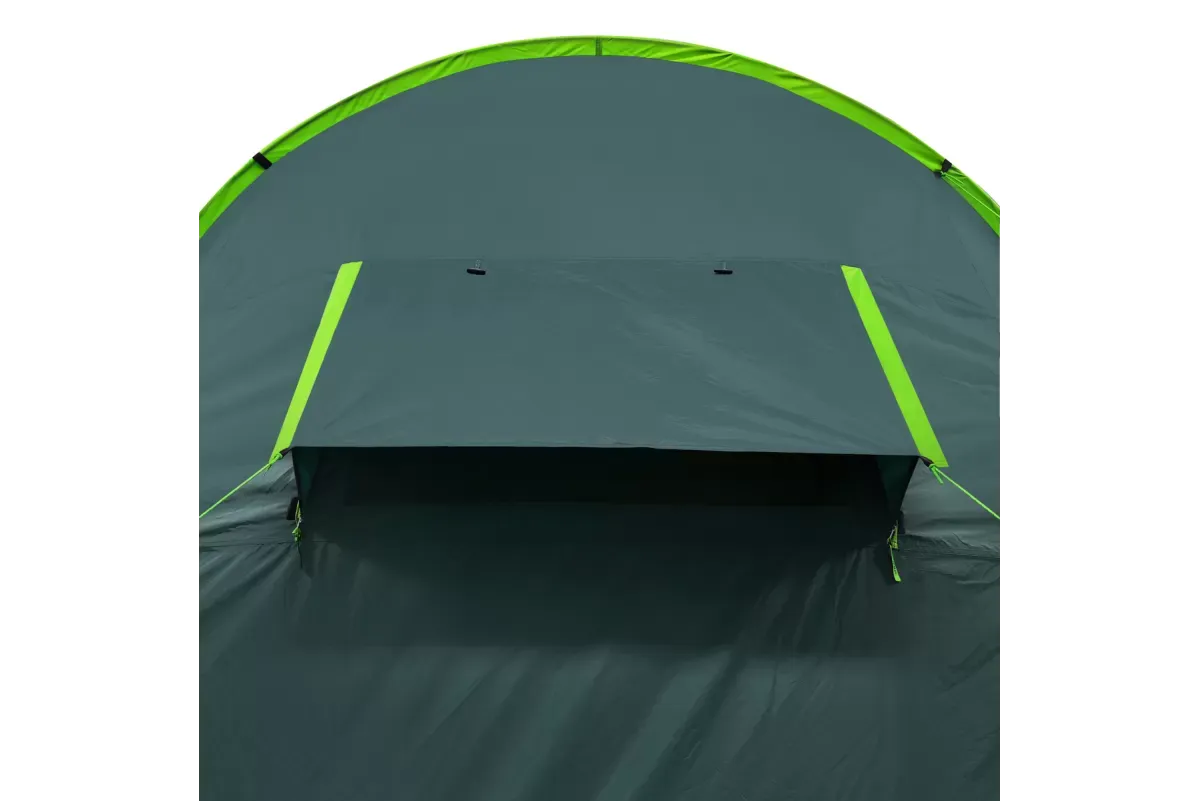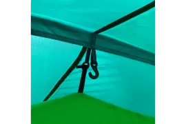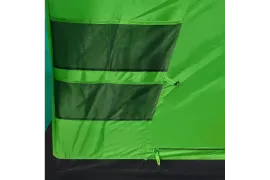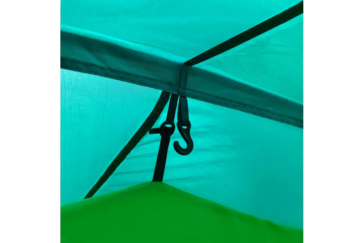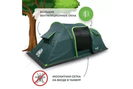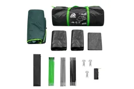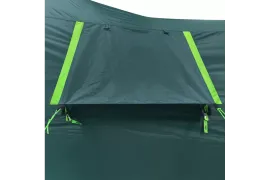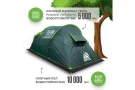 Палатка двухслойная, что обеспечивает хорошую вентиляцию и предотвращает скапливание конденсата. Внешний тент выполнен из полиэстера 210T с водонепроницаемостью 5000 мм. Пол изготовлен из материала Tarpayling высокой плотности с водонепроницаемостью 10000 мм. Каркас собран из фиберглассовых дуг диаметром 11 мм с металлическими наконечниками, обладающих гибкостью и прочностью. Устойчивость усилена штормовыми оттяжками, прошитыми светоотражающей нитью. Все швы и молнии защищены термоусадочной лентой для исключения протеканий.