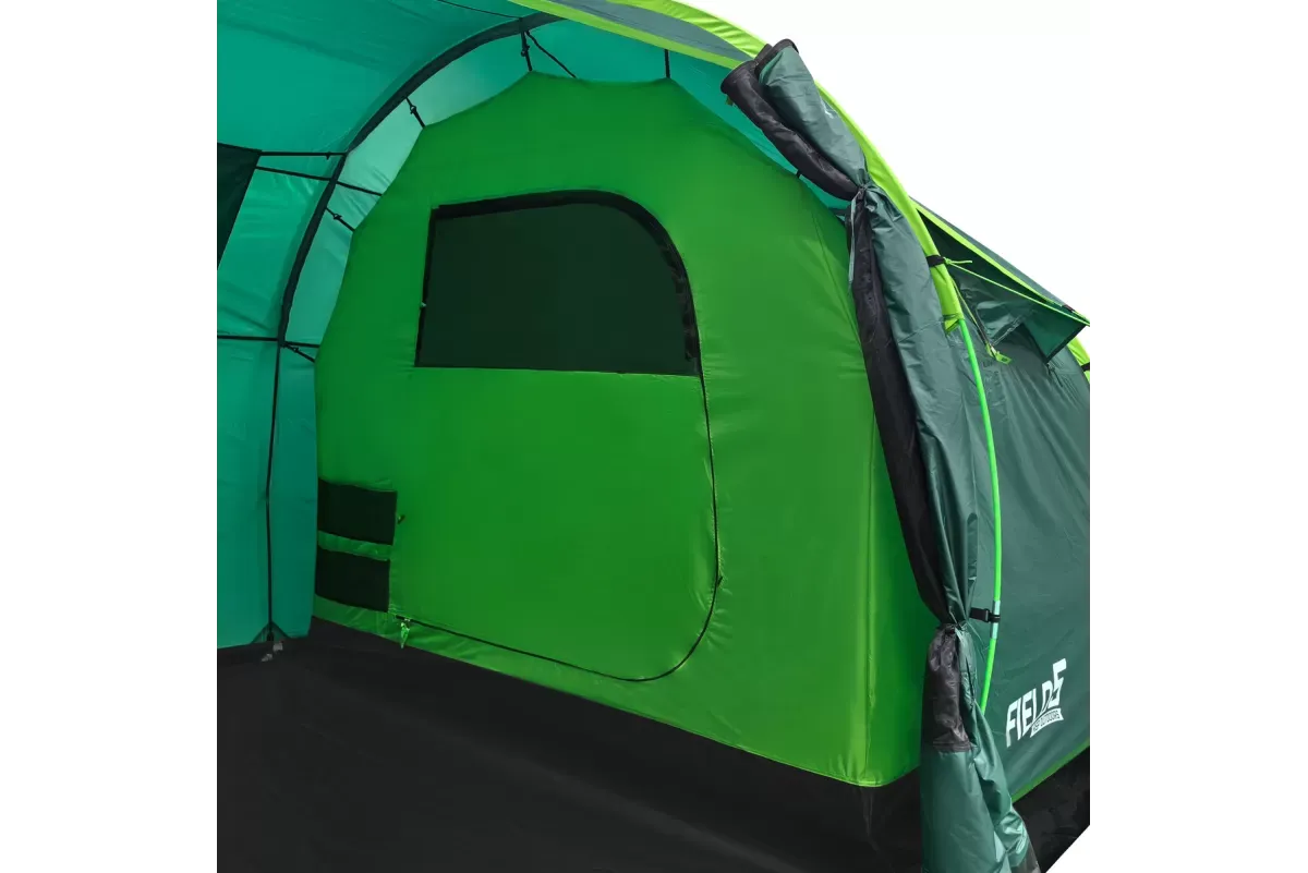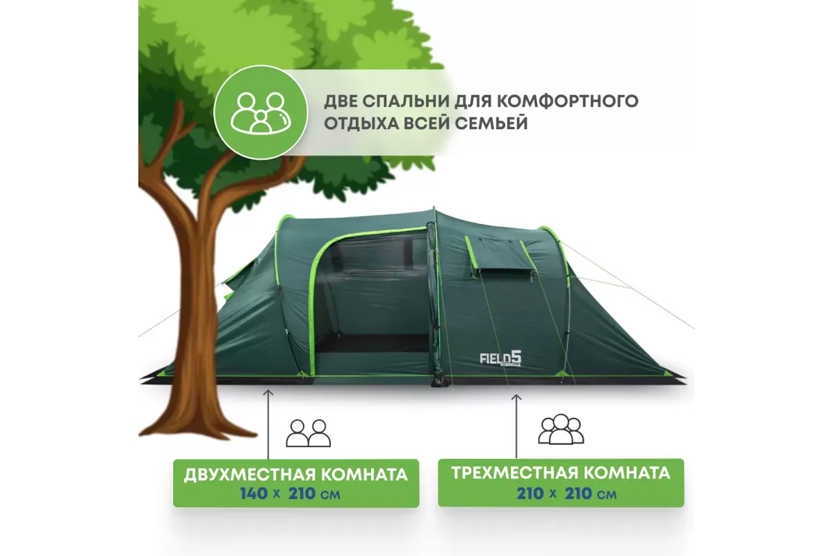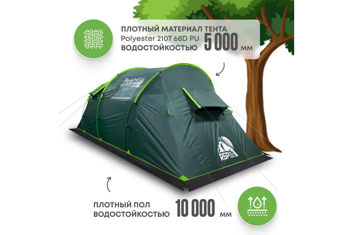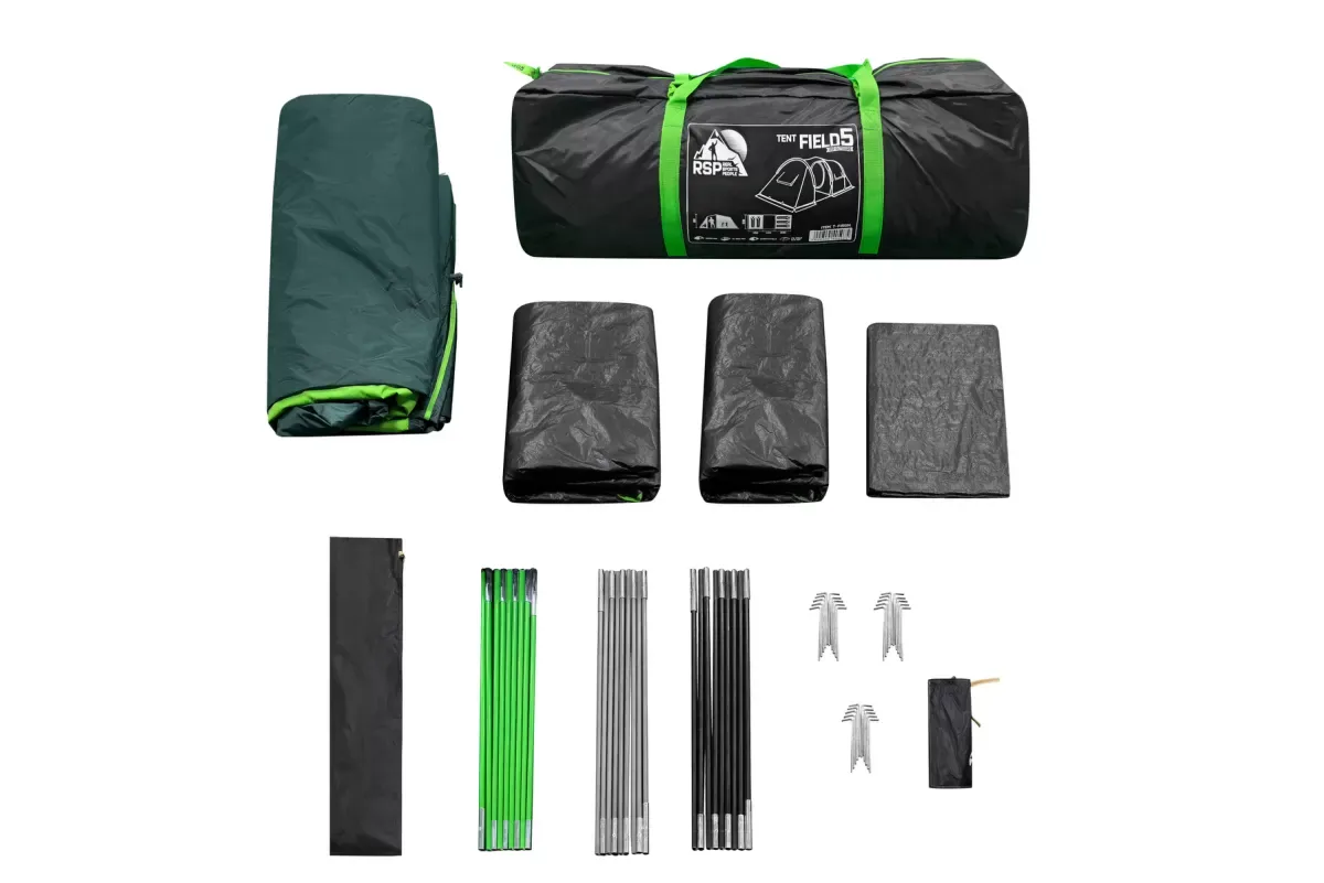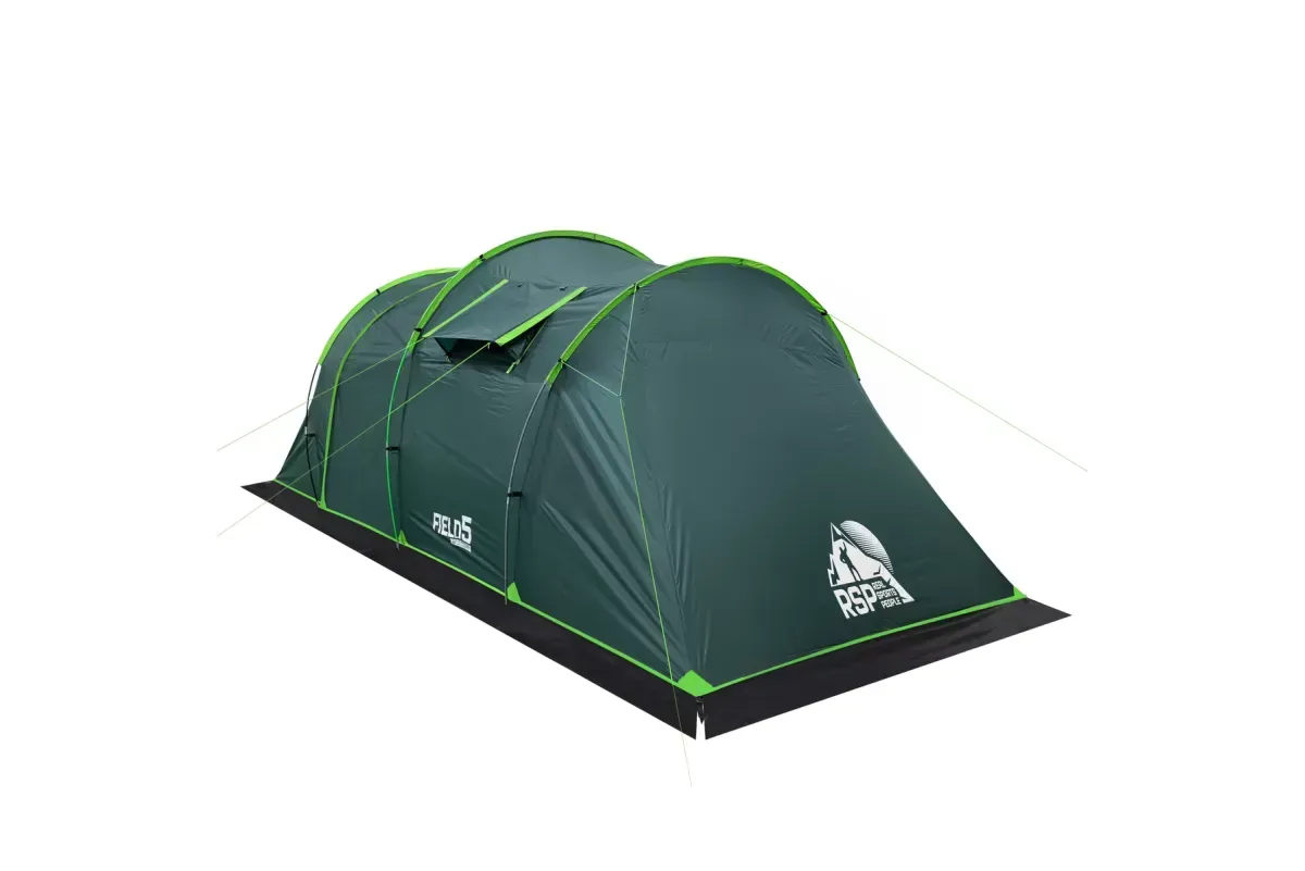 Палатка RSP Field 5 разработана для комфортного и продолжительного отдыха на природе. Модель имеет туннельную конструкцию с дугами, расположенными параллельно, что упрощает сборку и увеличивает внутренний объем по сравнению с купольными палатками. Один человек может установить ее за несколько минут. Сначала монтируется верхний тент, что позволяет сохранить спальни и вещи сухими при установке в дождливую погоду.