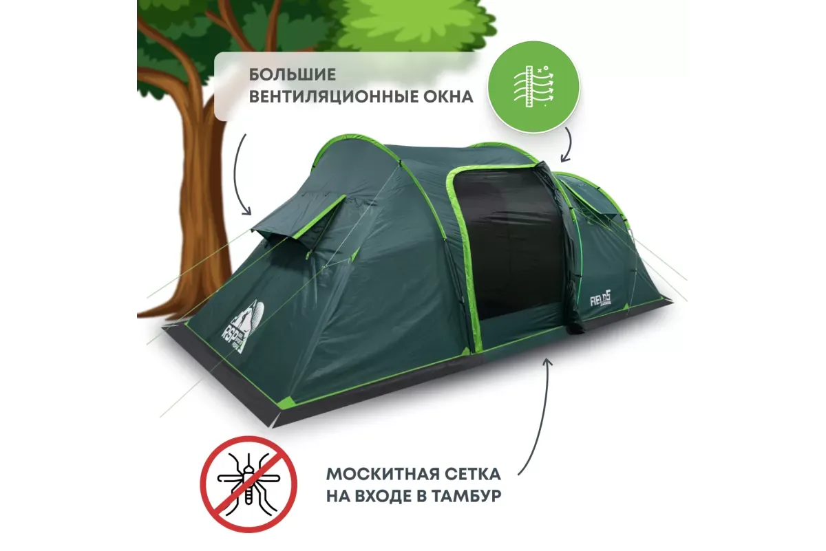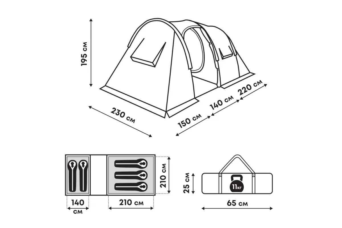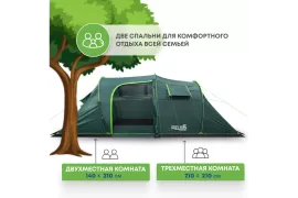 Модель трансформируется под разное количество человек — от 2 до 5. Внутри две независимые спальни на 2 и 3 места, между ними тамбур. При необходимости можно использовать только одну спальню, увеличивая тамбур до размеров шатра. Высота тамбура до 190 см, в нем предусмотрен съемный пол. В палатке есть кармашки для мелочей в тамбуре и спальнях, а также крючки для подвешивания фонарика в спальных комнатах.Бренд: RSP