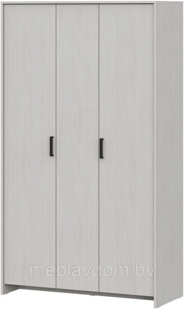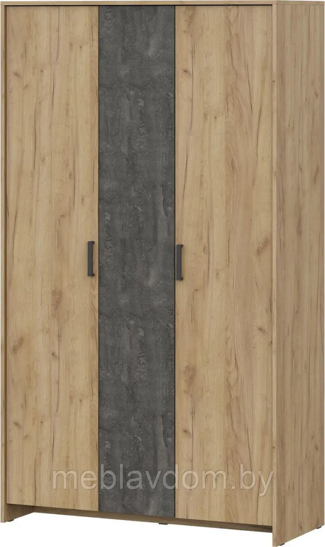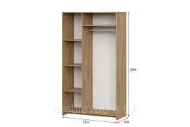 Шкаф оборудован створками разной ширины. Крайние створки имеют ширину 413 миллиметров, а средняя — 328 миллиметров. Внутри шкафа установлена вертикальная перегородка, разделяющая его на две секции: бельевую и платяную. В левой бельевой секции, которая занимает 418 миллиметров, расположены две съемные и одна стационарная полка. Правая платяная секция, шириной 734 миллиметра, оснащена стационарной полкой сверху и металлической штангой для вешалок.