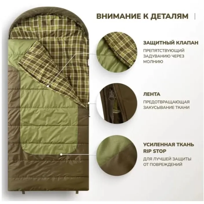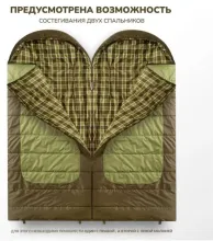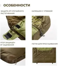 Москитная сетка пристегивается к спальнику и капюшону для полной защиты от насекомых, при необходимости убирается в специальный карман. Предусмотрена возможность состегивания двух спальников с разным направлением молнии в один шириной 200 см. В ножной части есть петли для просушки.