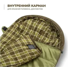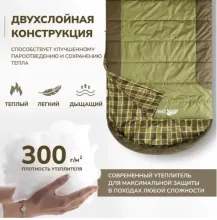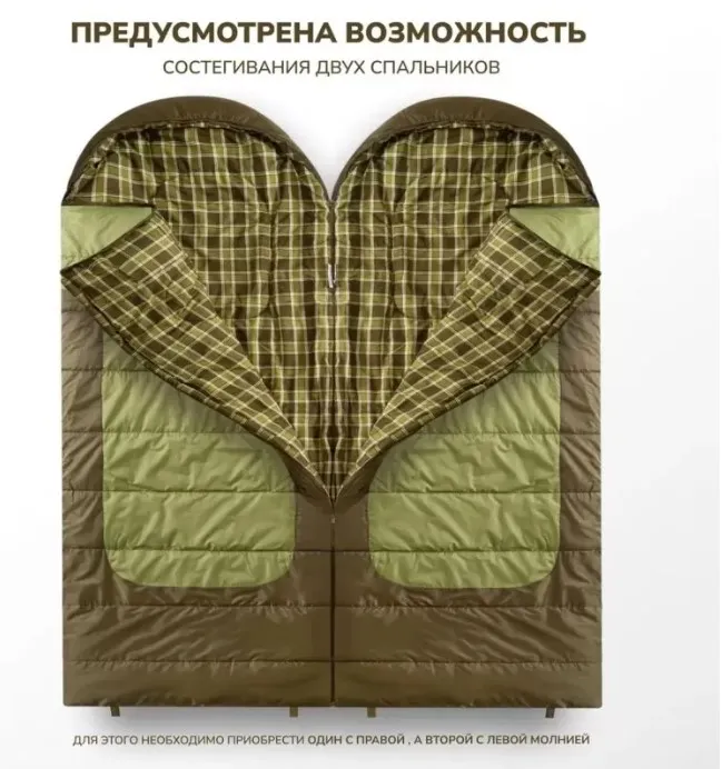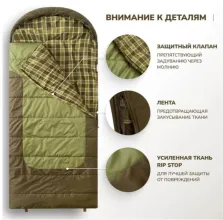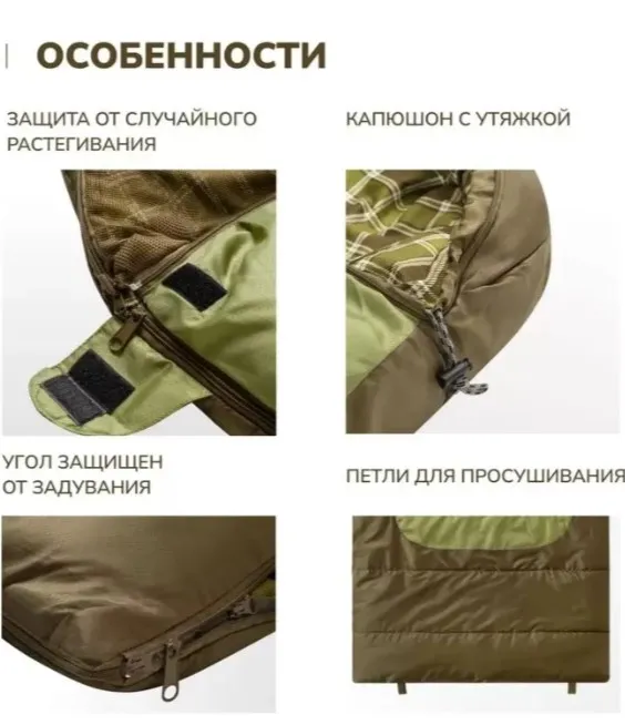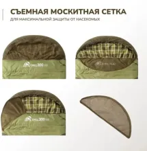 Москитная сетка пристегивается к спальнику и капюшону для полной защиты от насекомых, при необходимости убирается в специальный карман. Предусмотрена возможность состегивания двух спальников с разным направлением молнии в один шириной 200 см. В ножной части есть петли для просушки.